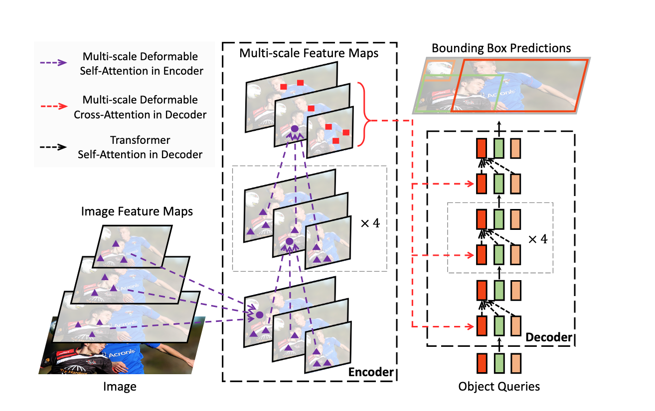 RF-DETR 使用的架构基于可变形 DETR 论文中的基础。Deformable DETR 使用多尺度自注意力机制,而我们从单尺度主干中提取图像特征图。