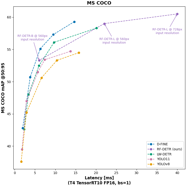 特别是在 COCO 上,RF-DETR 相对于 YOLO 模型严格来说是帕累托最优的,并且在基于实时变压器的模型方面具有竞争力 - 尽管严格来说不是更高性能。然而,在发布 RF-DETR-large 并使用 728 输入分辨率时,RF-DETR 实现了任何实时的最高 mAP (60.5)(Papers with Code 将“实时”定义为 T4 上的 25+ FPS)。