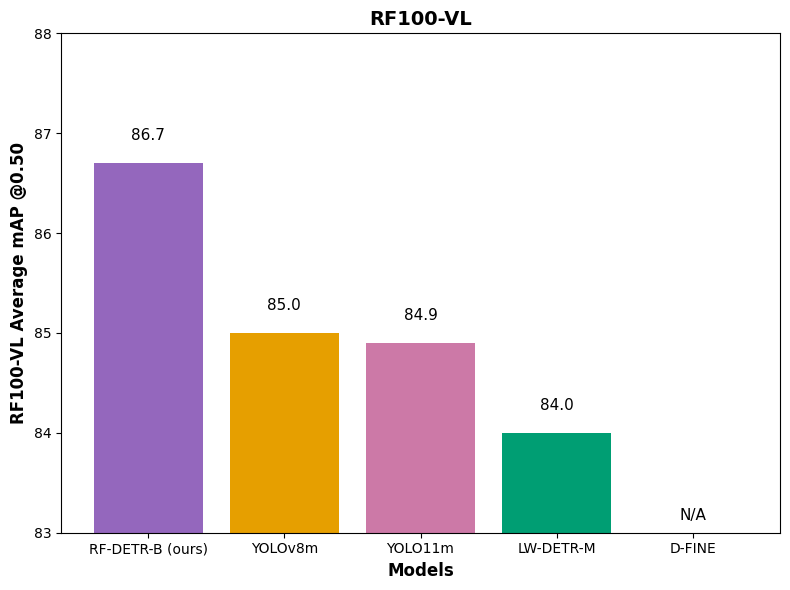 其次,D-FINE 微调不可用,因此无法获得其域适应性。它的作者指出,“如果你的类别非常简单,它可能会导致过度拟合和次优的性能。还有许多悬而未决的问题阻碍了微调。我们打开了一个问题,旨在将 D-FINE 与 RF100-VL 进行基准测试。